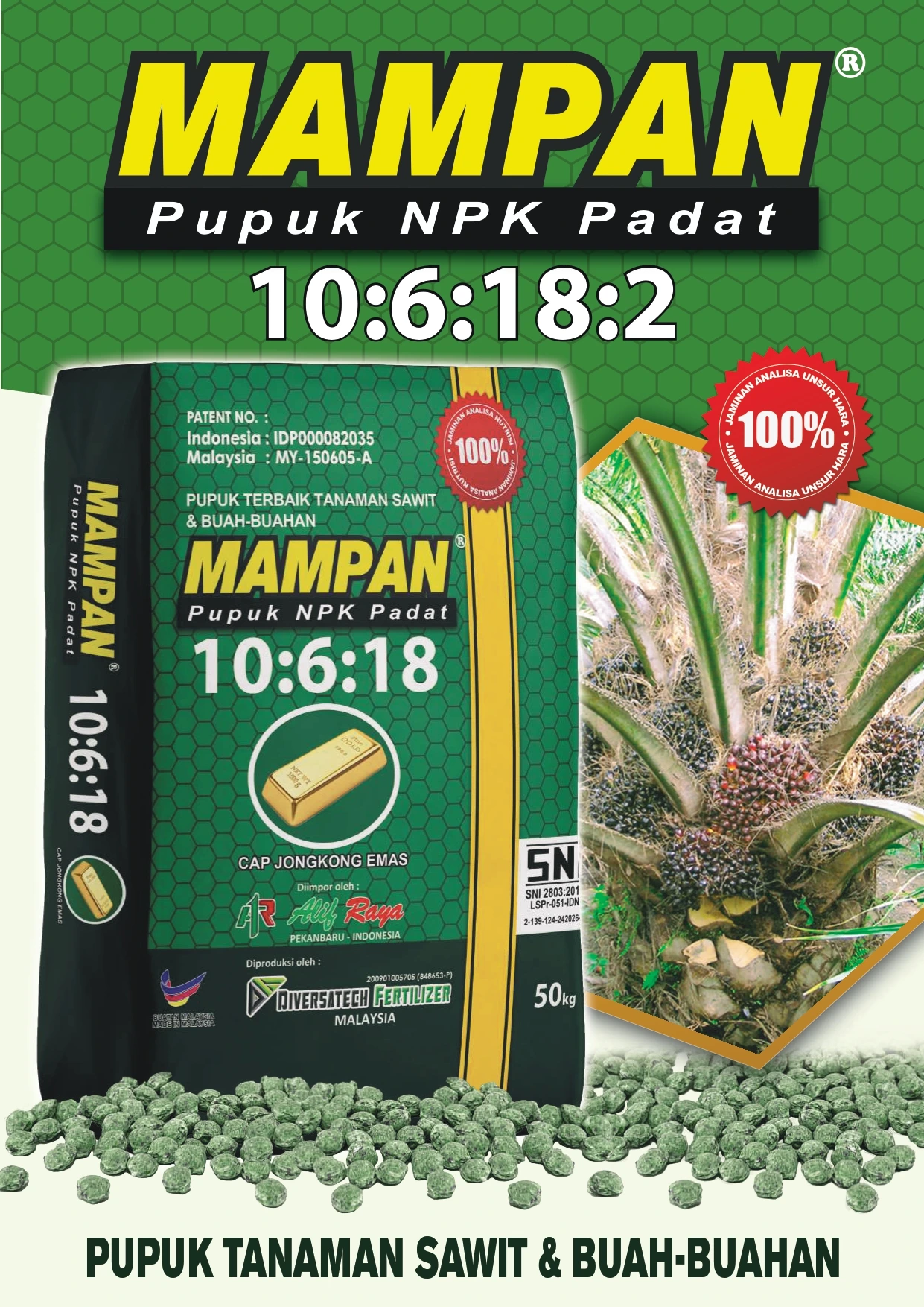 Pupuk NPK Padat dengan komposisi 10 : 6 : 18 : 2 . Tepat untuk Tanaman Sawit dan Buah-buahan.