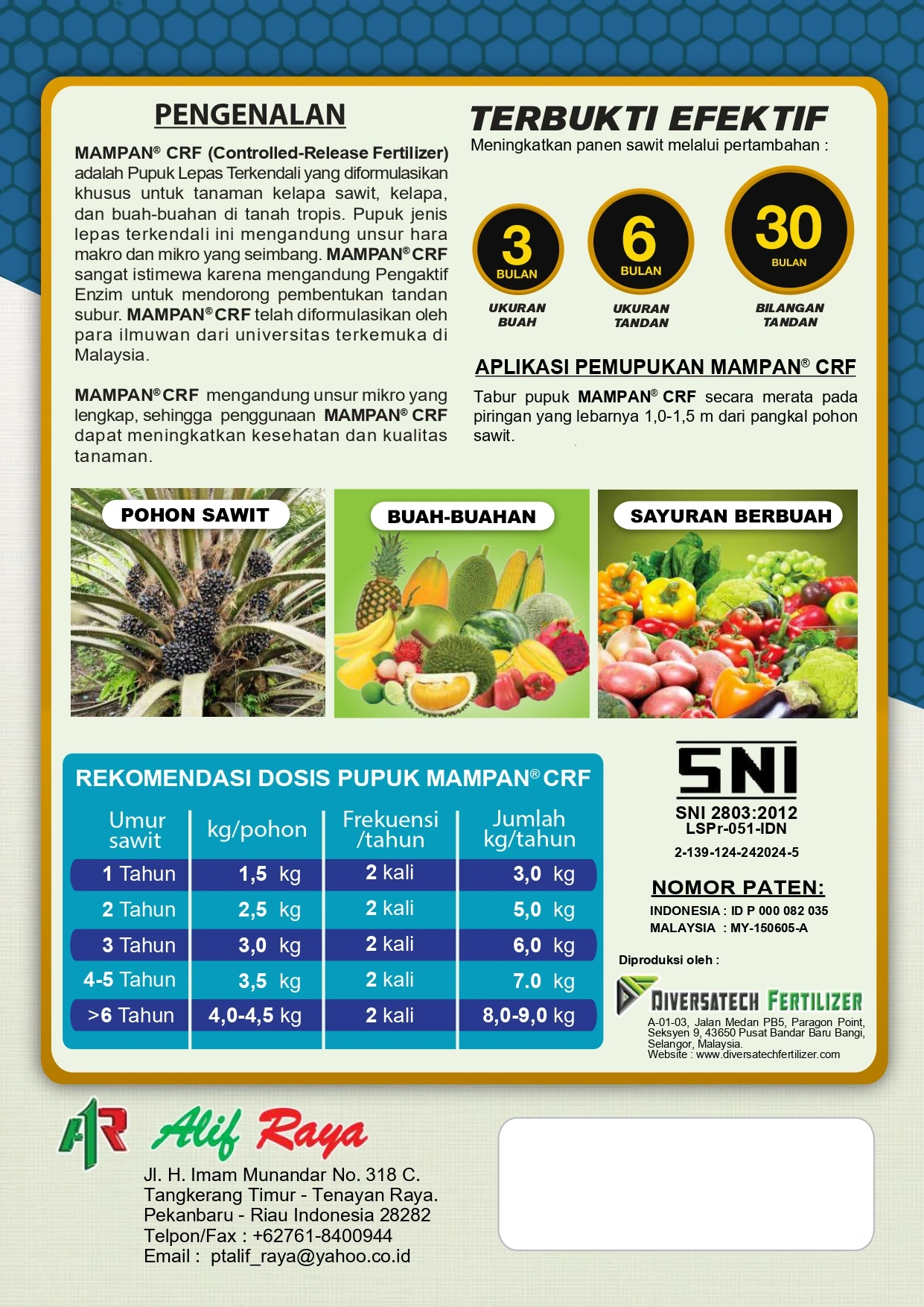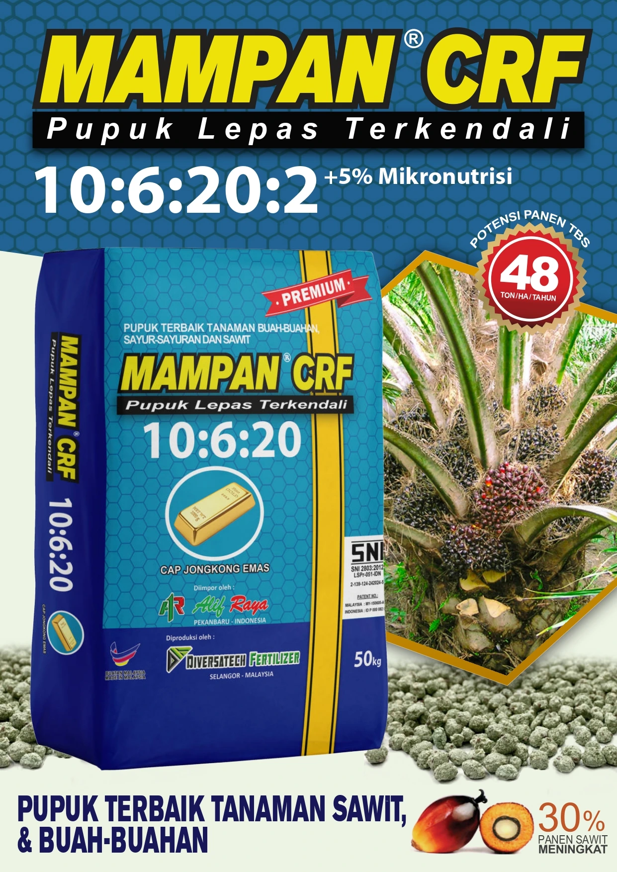 04. MAMPAN® CRFPupuk Lepas Kendali dengan komposisi 10 : 6 : 20 : 2 di tambah 5% Mikronutrisi. Pupuk yang tepat untuk tanaman sawit dan buah-buahan.