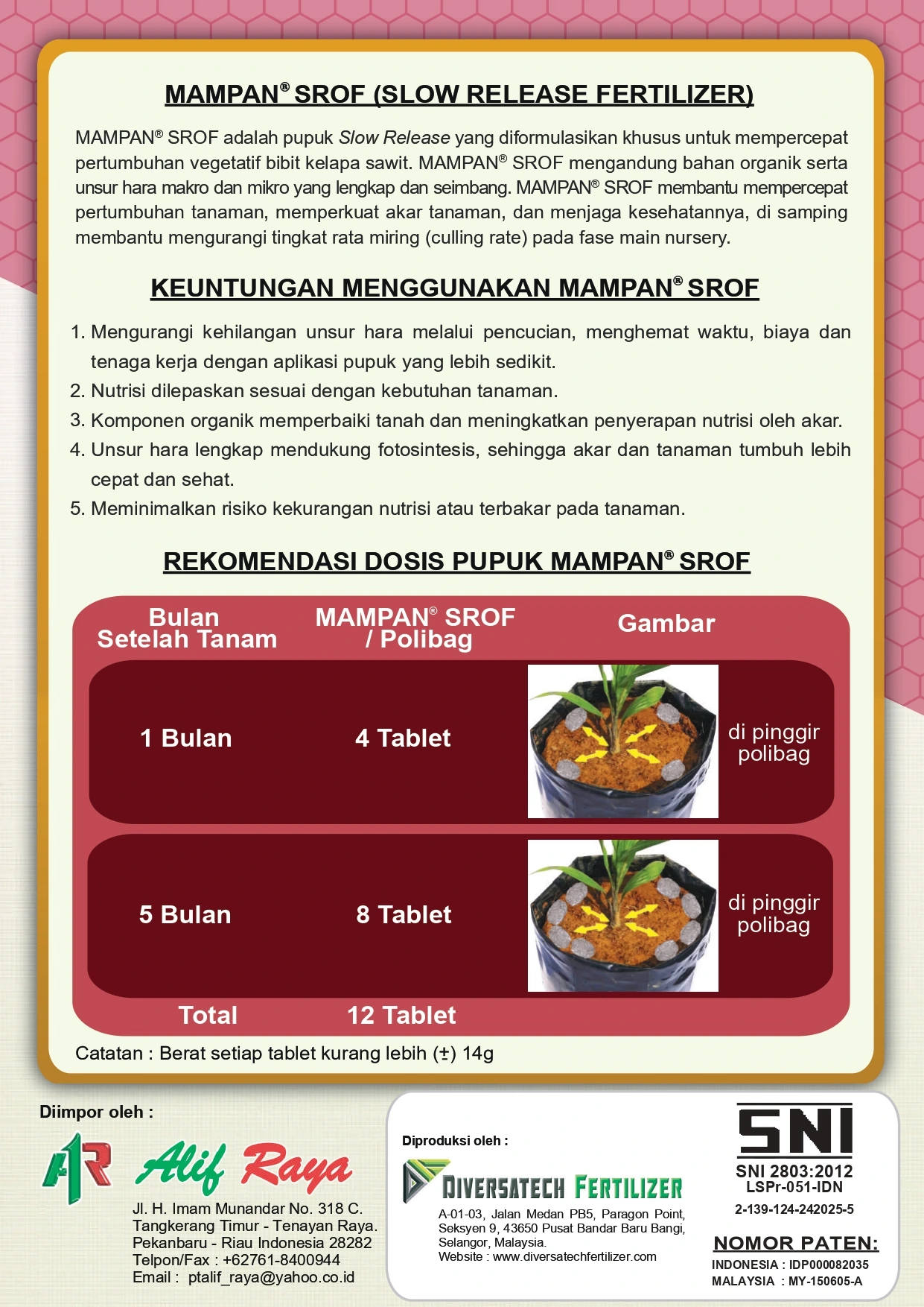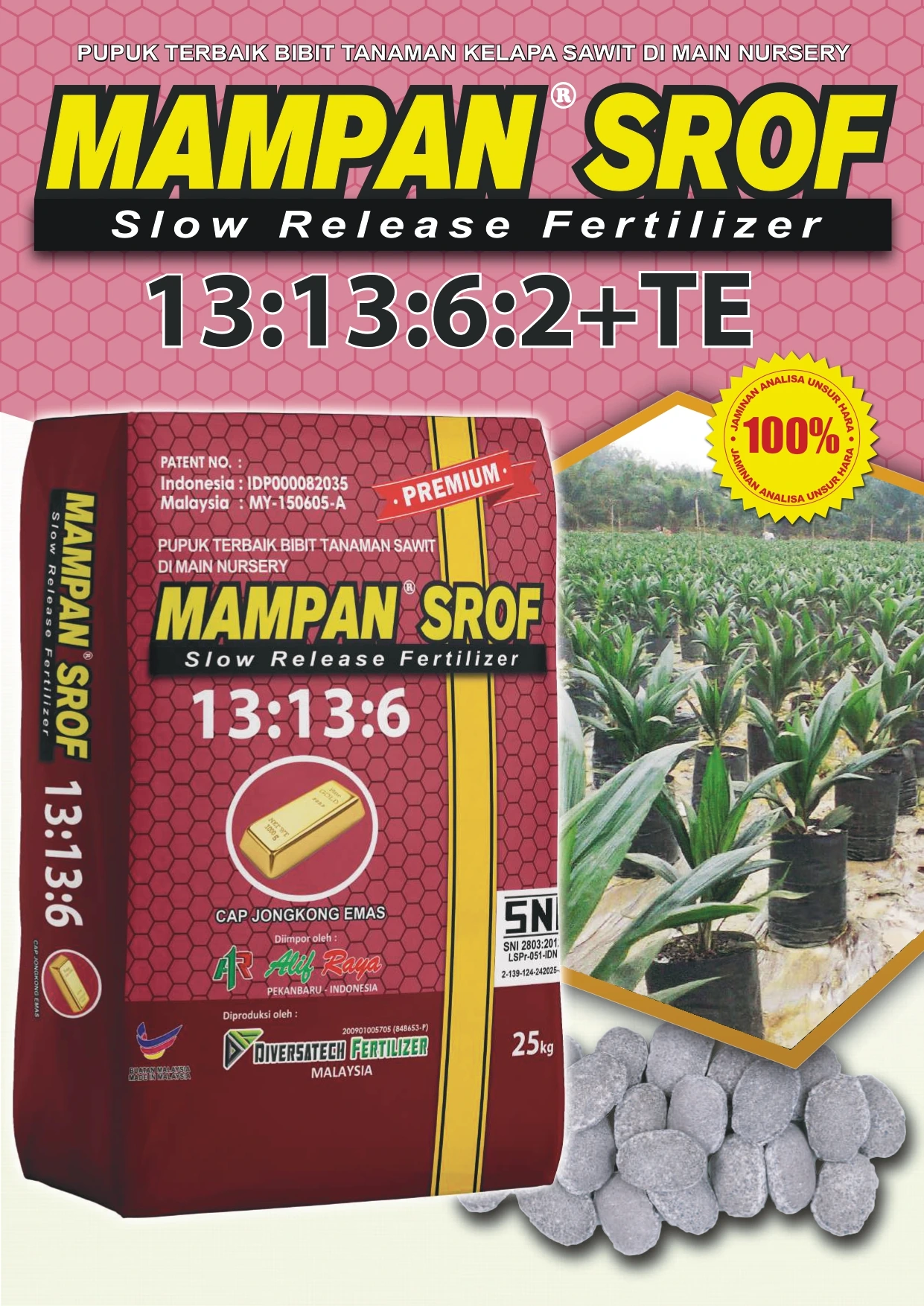 Pupuk tipe Slow Release Fertilizer dengan komposisi 13 : 13 : 6 : 2 di tambah Nutrisi TE yang cocok untuk bibit tanaman.